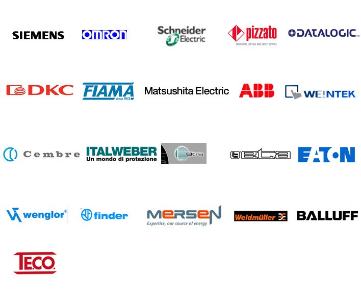 Marchi commercializzati: SIEMENS, WEIDMULLER, SCHNEIDER – TELEMECANIQUE, PIZZATO, OMRON, DATALOGIC, DATASENSOR, DIELL, ELTRA, WENGLOR, DKC, FIAMA, TOSHIBA, WEINTEK, TE.CO., CEMBRE, FINDER, ABB, ITALWEBER, MERSEN, ELTRA, EATON BALLUFF, YASKAWA, PILZ, MATSUSHITA ELETRIC, CEB, BOCCHIOTTI, ETA, QEM, LAPP KABEL, GEFRAN, SELEMA, GERIT, SCHMALZ, SUNX